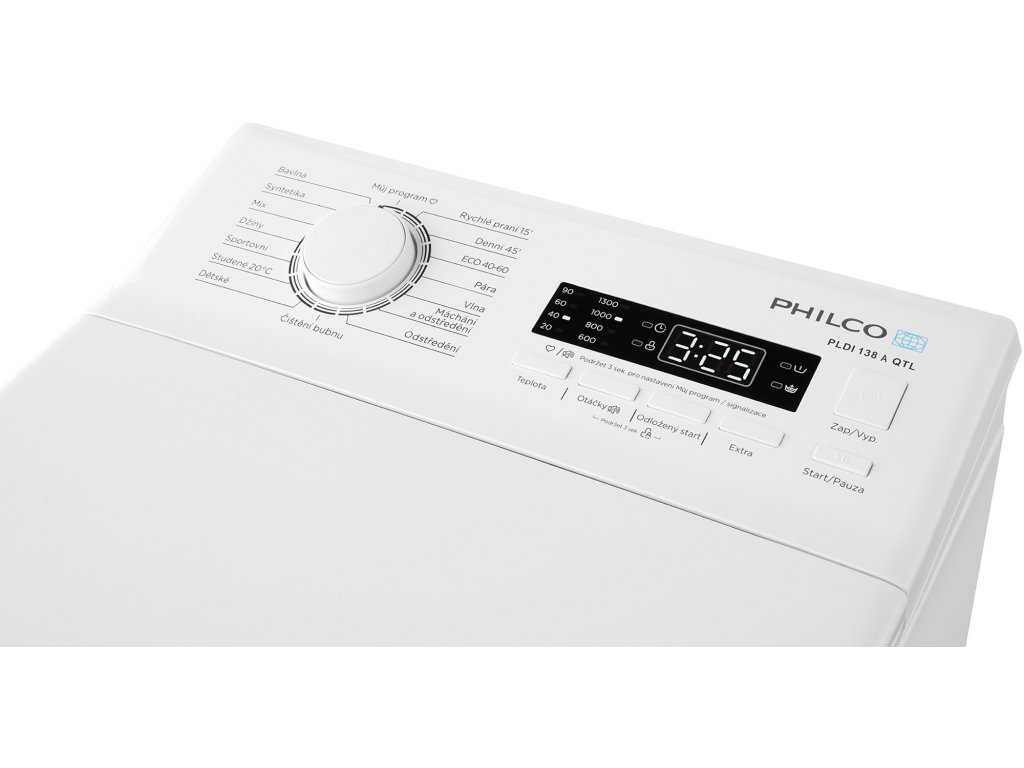Vrchem plněná parní pračka Philco PLDI 138 AQTLN vypere až 8 kg prádla potichu, úsporně a spolehlivě díky invertorovému motoru se zárukou 10 let.