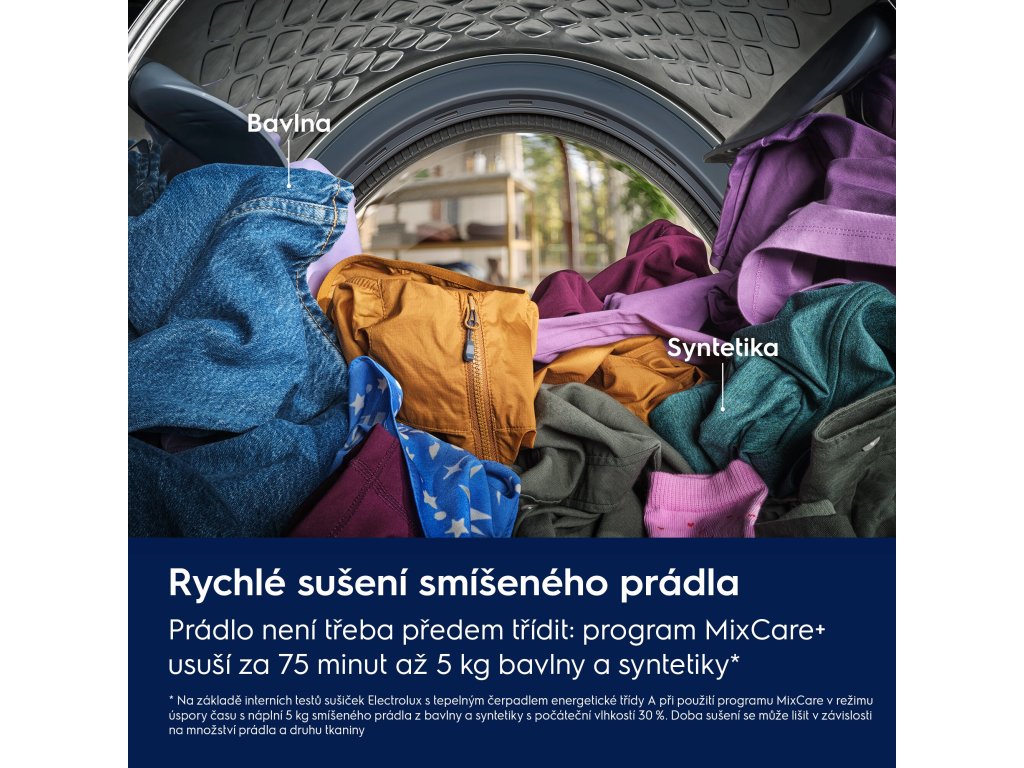 *Na základě interních testů porovnávajících sušičky Electrolux energetické třídy A s tepelným čerpadlem v režimu úspory času a úspory energie se sušičkami Electrolux energetické třídy B při 179minutovém sušení 8kg náplně v programu MixCare.